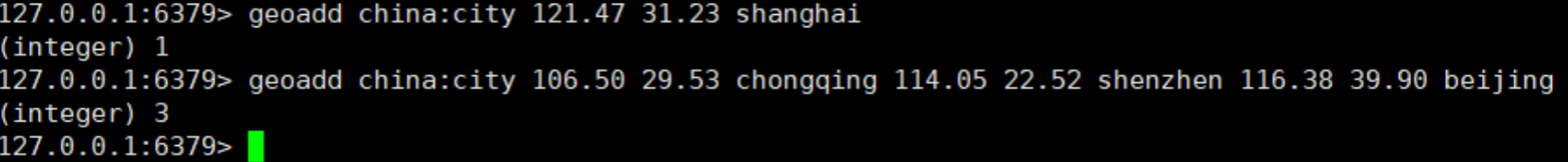 geoadd china:city 106.50 29.53 chongqing 114.05 22.52 shenzhen 116.38 39.90 beijing
